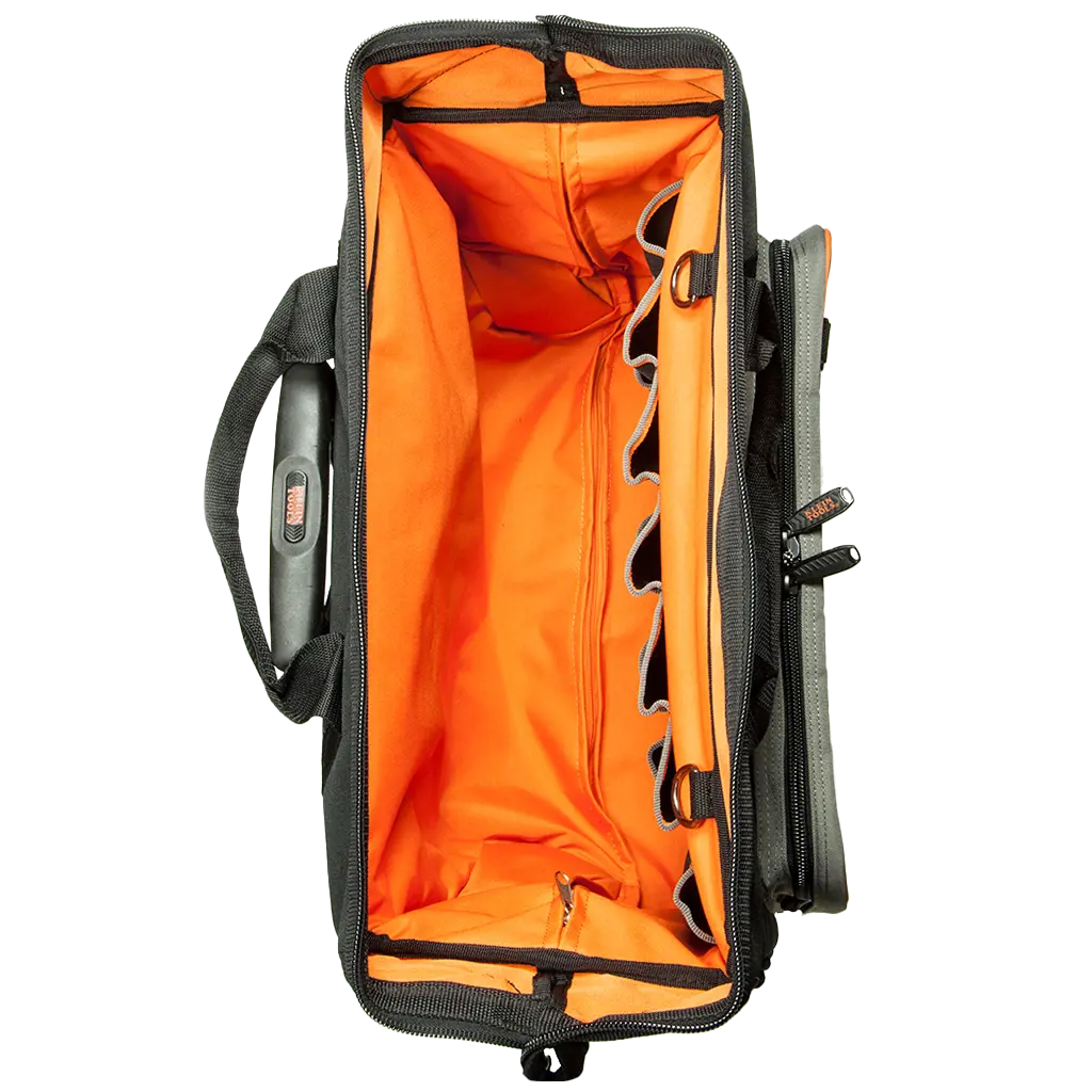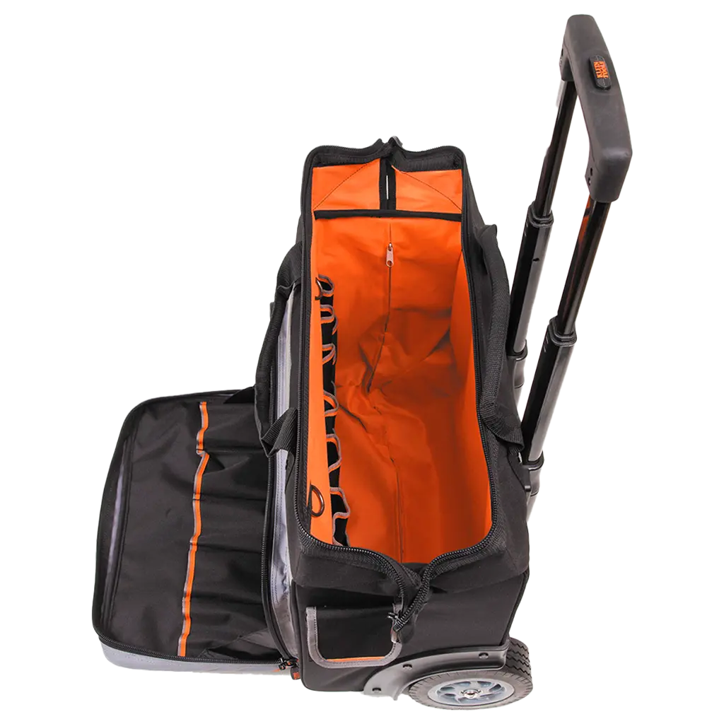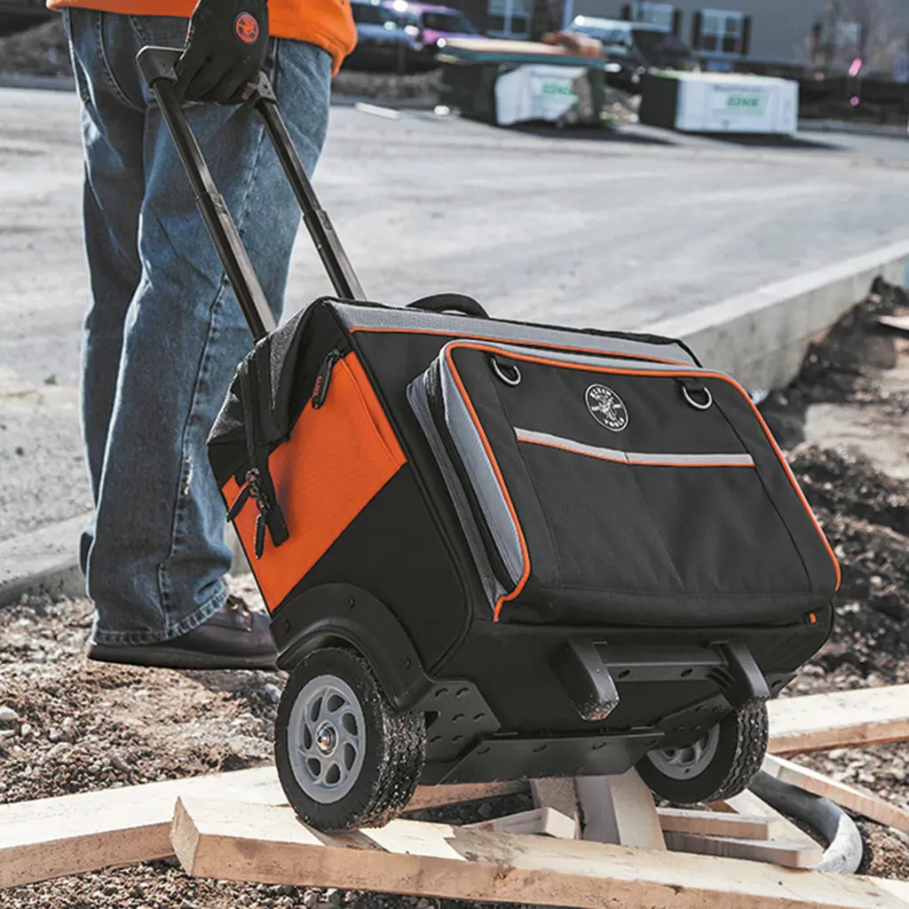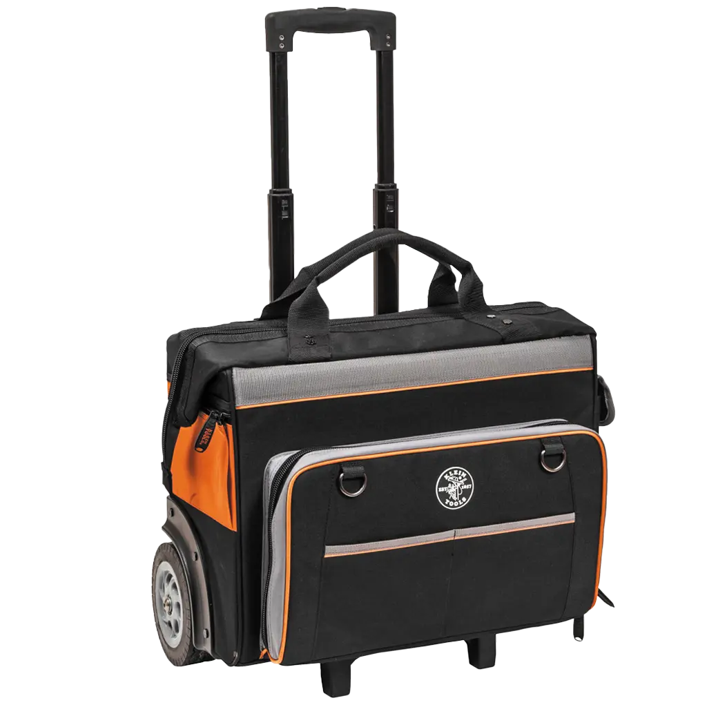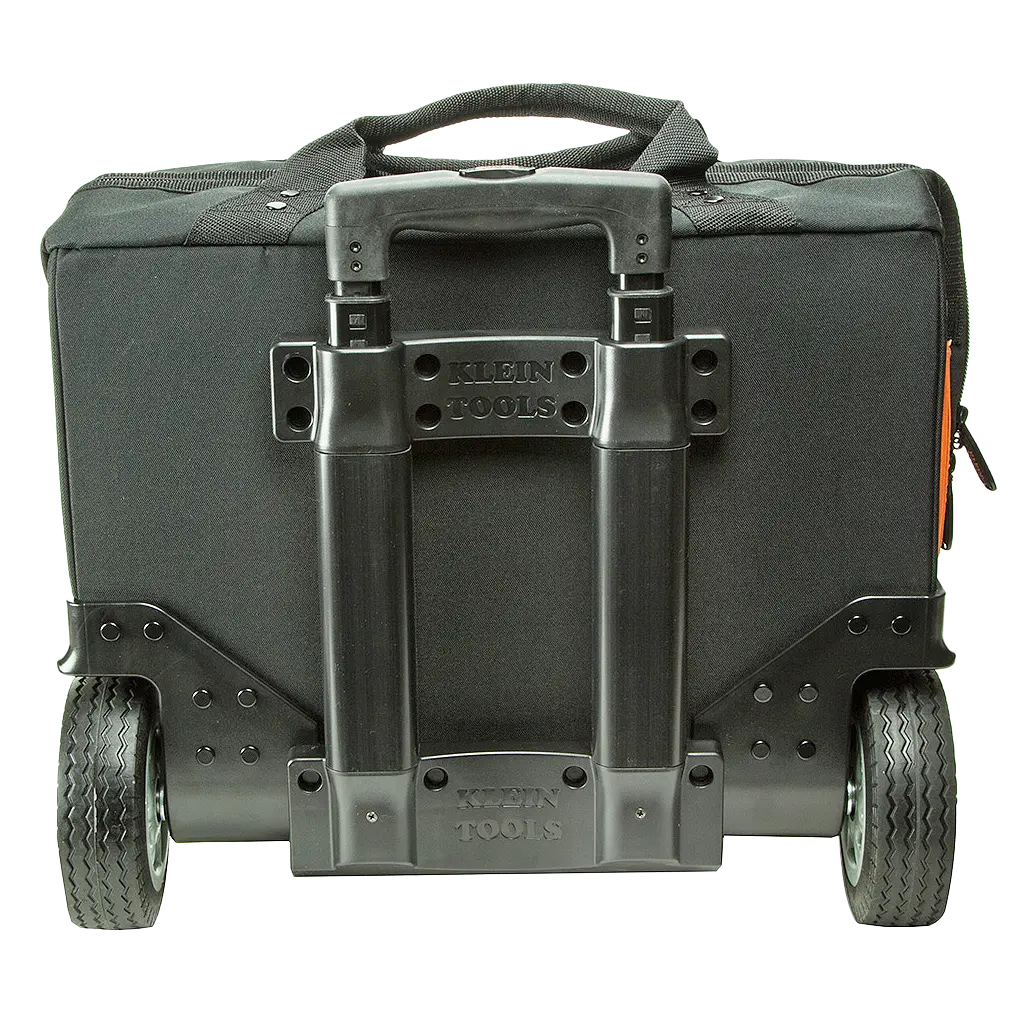 With our Klein Tools Tradesman Pro™ Organizer Rolling Tool Bag, move your tools around the jobsite with ease with wheels and a telescoping handle. The rugged 6-Inch wheels can easily handle rough terrain. This tough bag can store up to 100-pound (45.4 kg) of tools and materials inside, and another 100-pound (45.4 kg) stacked on top.