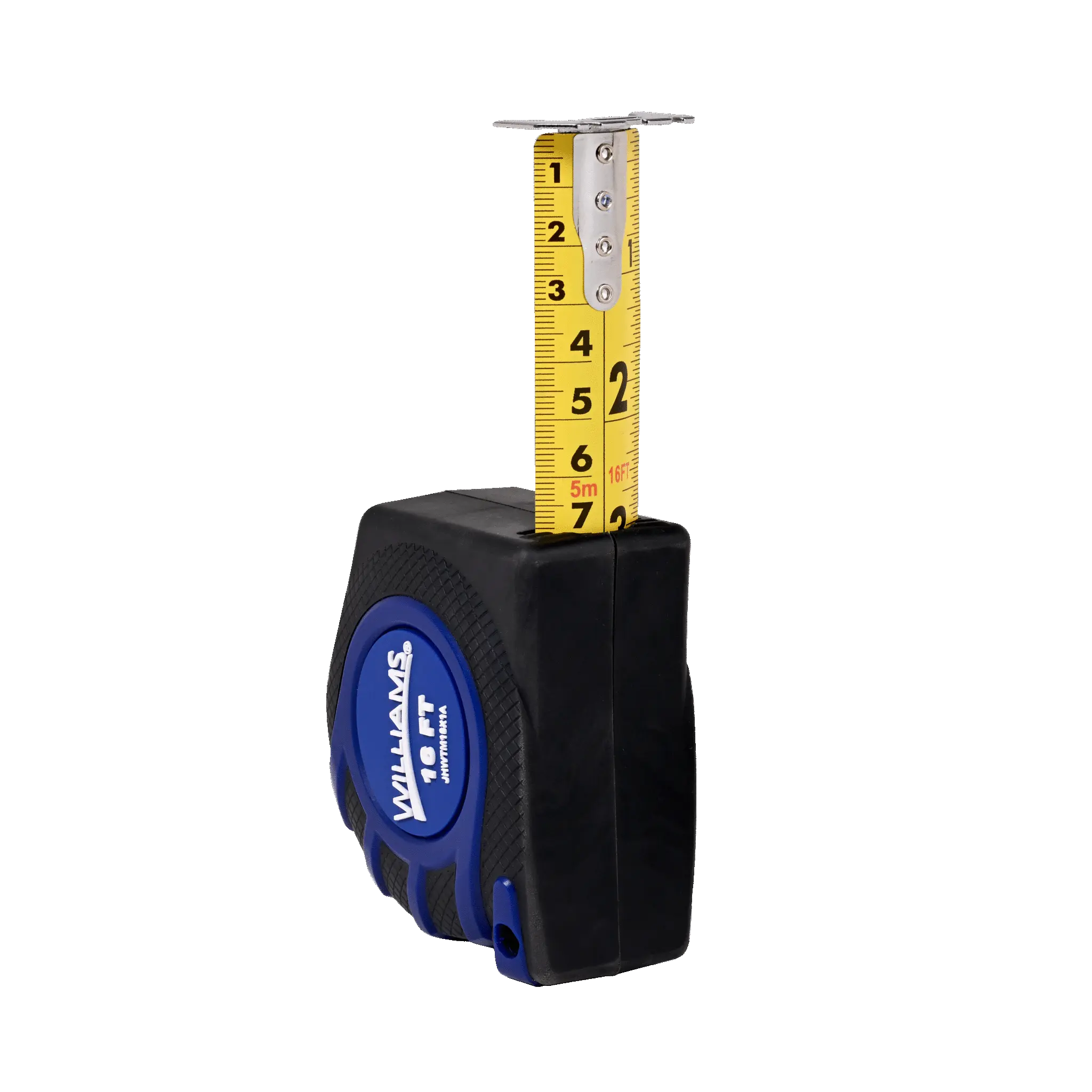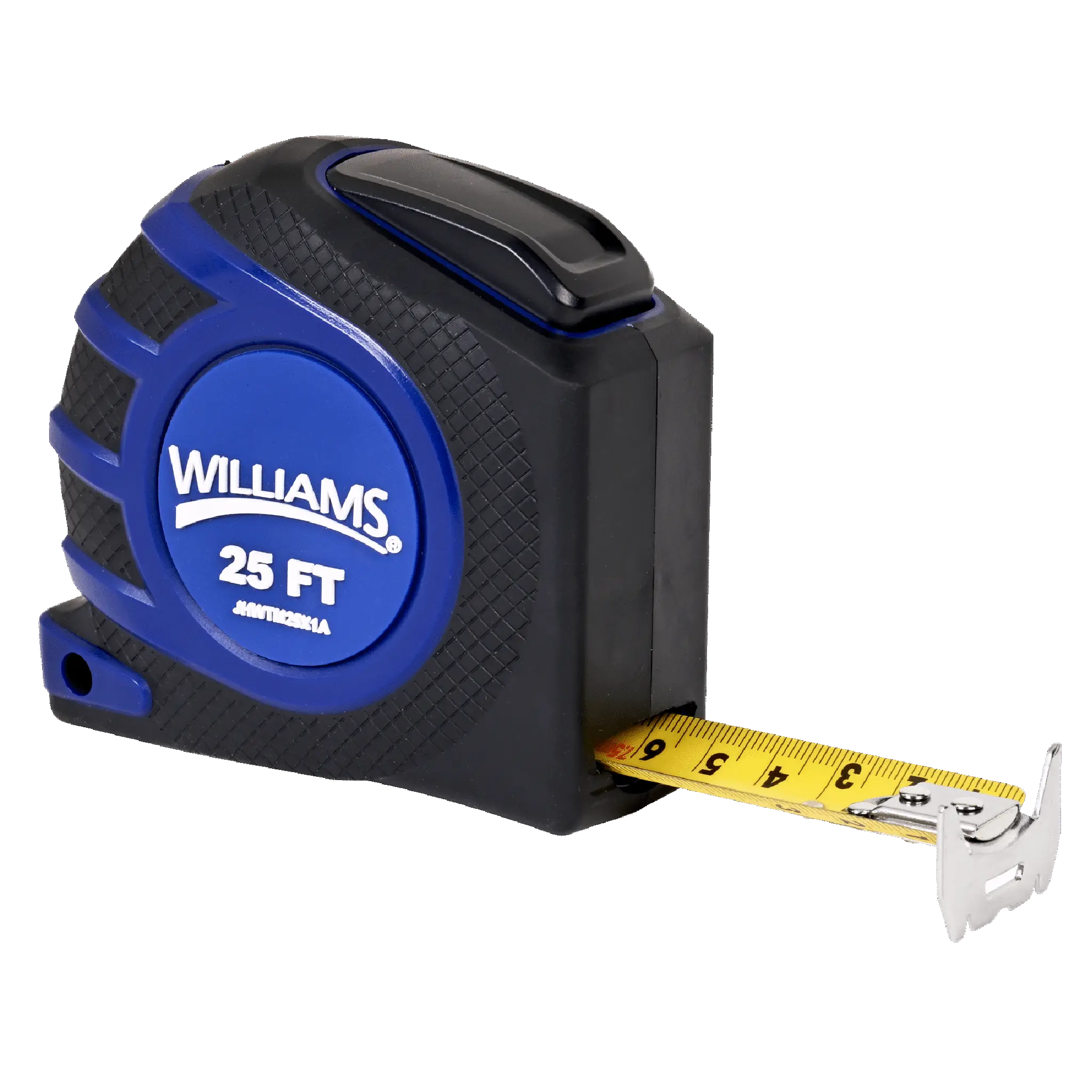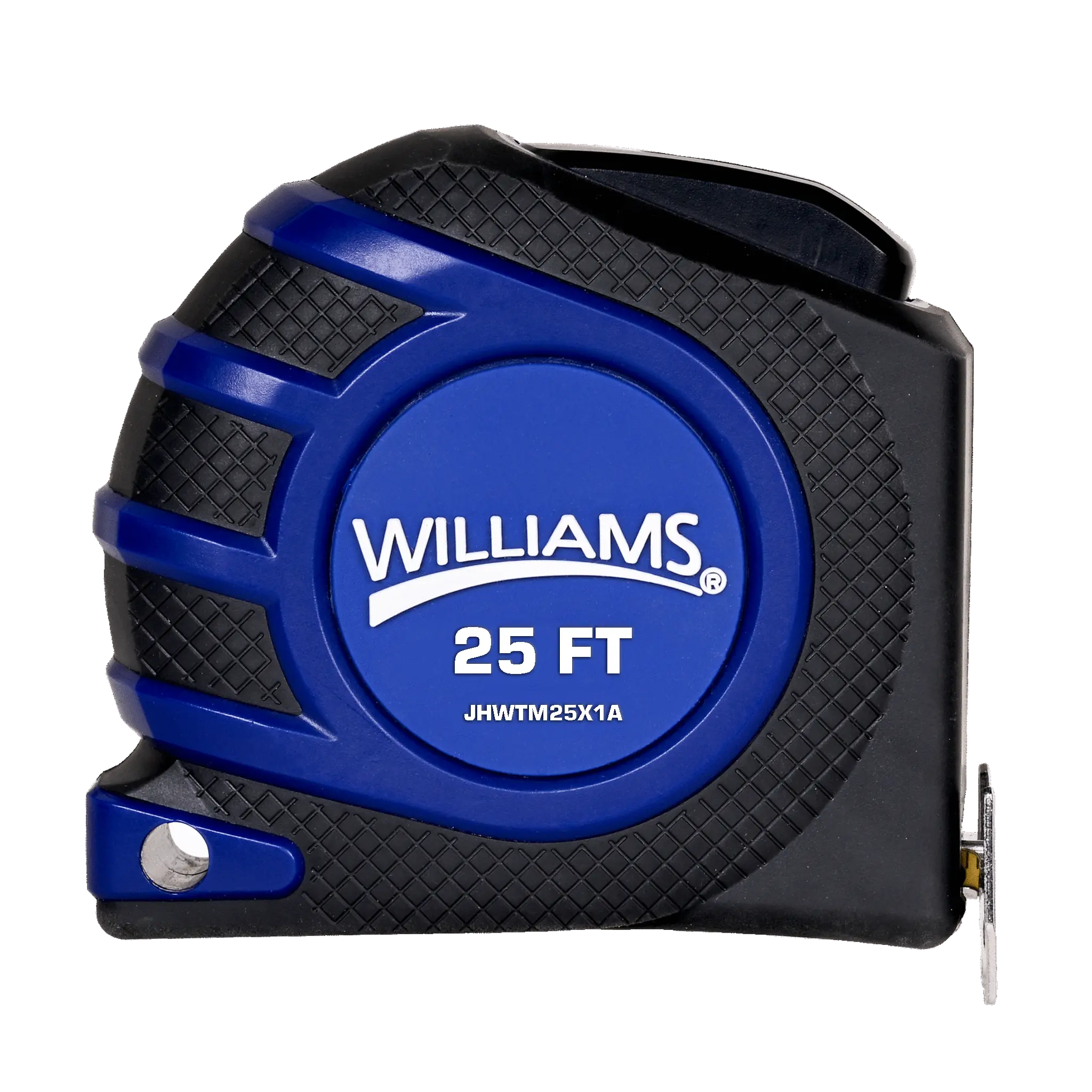 Tether-Ready Williams 25-foot Measuring Tape with Safety Attachment Point and measurements on both sides of blade.